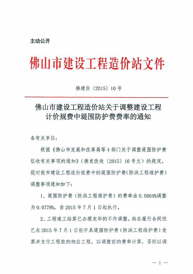 佛山市建設工程造價站關于調整建設工程計價規(guī)費中堤圍防護費費率的通知