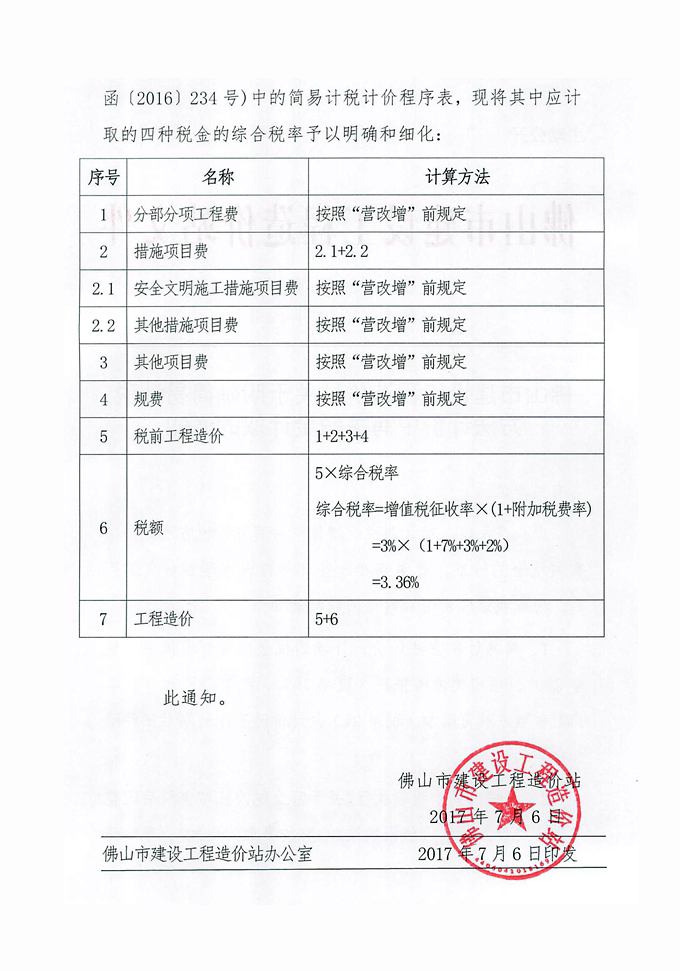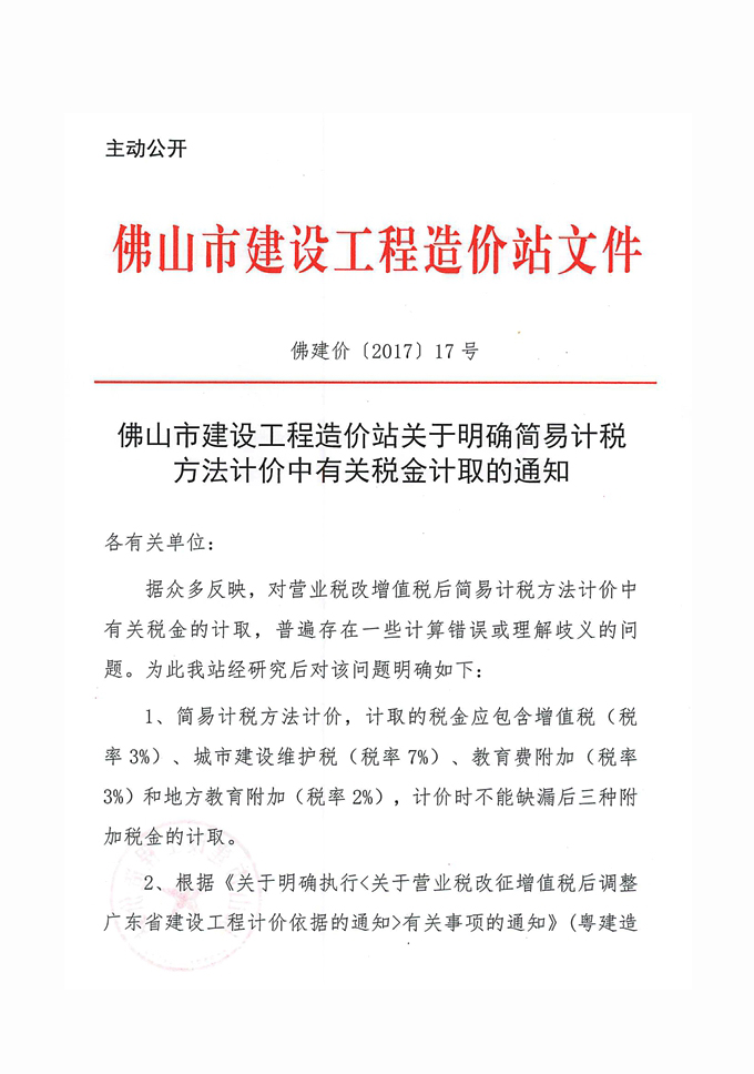 佛山市建設(shè)工程造價(jià)站關(guān)于明確簡(jiǎn)易計(jì)稅方法計(jì)價(jià)中有關(guān)稅金計(jì)取的通知