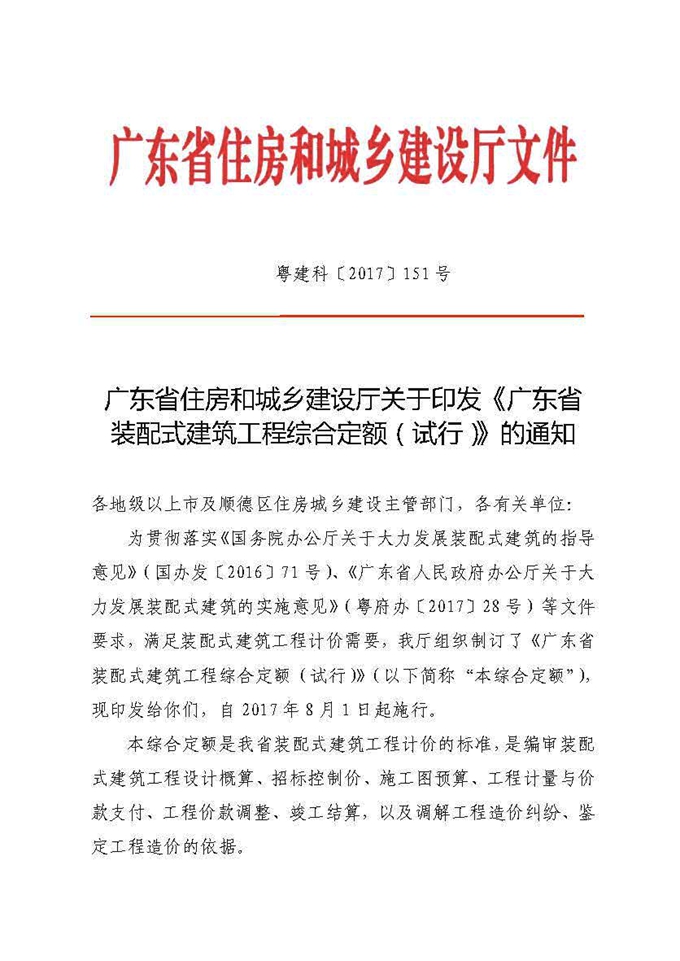 廣東省住房和城鄉建設廳關于印發《廣東省裝配式建筑工程綜合定額(試行)》的通知