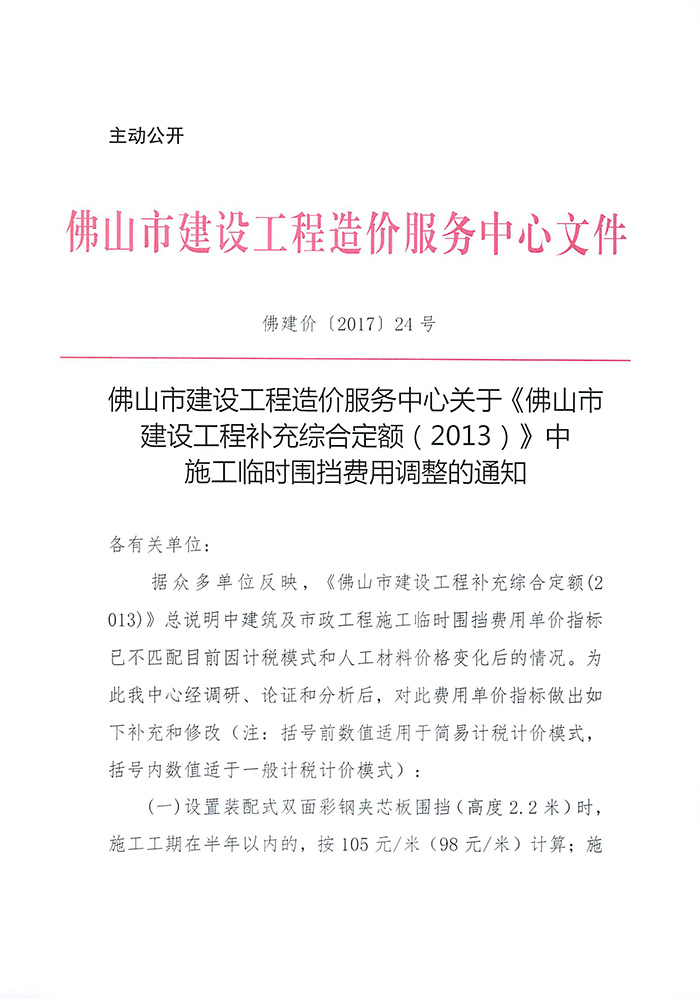 佛山市建設(shè)工程造價服務(wù)中心關(guān)于《佛山市建設(shè)工程補充綜合定額(2013)》中施工臨時圍檔費用調(diào)整的通知