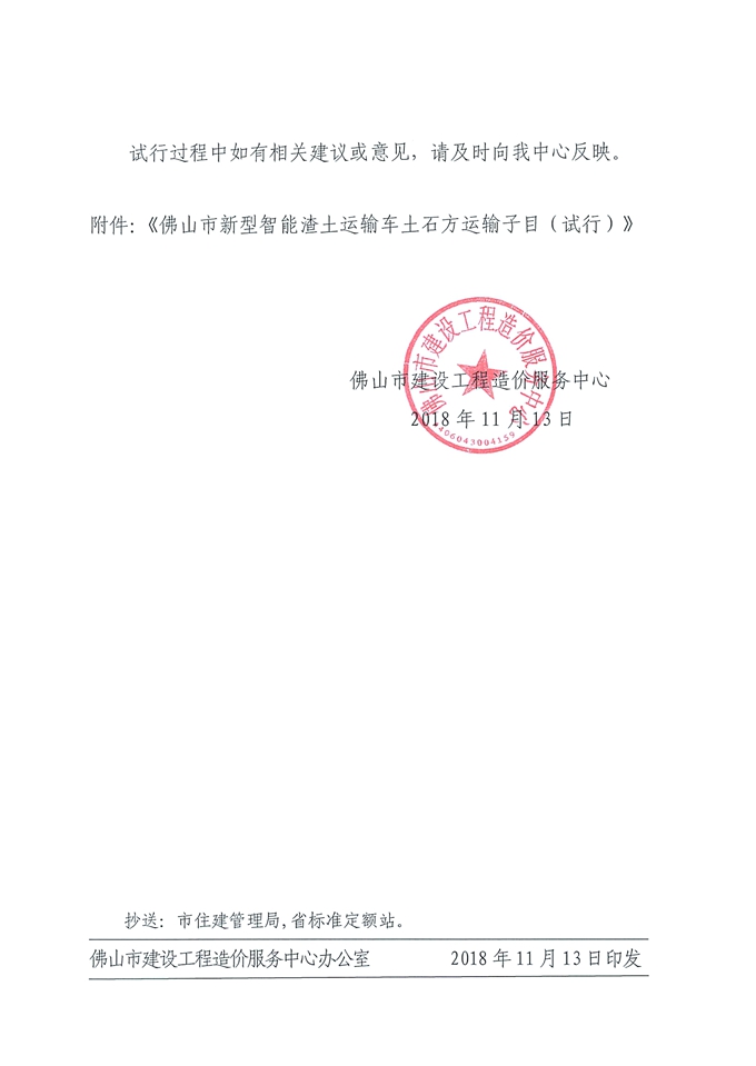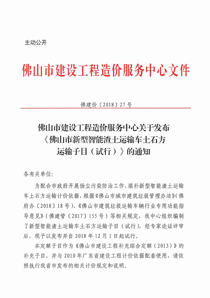 佛山市建設工程造價服務中心關于發布《佛山市新型智能渣土運輸車土石方運輸子目(試行)》的通知