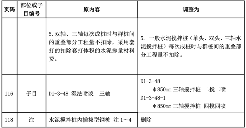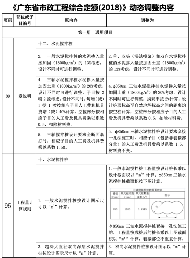 近期,我站組織專家研析了廣東省建設工程定額動態(tài)管理系統(tǒng)收集的反饋意見,《廣東省市政工程綜合定額(2018)》一般水泥攪拌樁(濕法噴漿 三軸)與市場實際存在一定差異。為加強定額動態(tài)管理,經廣泛調研與測算,現(xiàn)將一般水泥攪拌樁(濕法噴漿 三軸)項目調整后的內容印發(fā)。本調整內容與省現(xiàn)行工程計價依據(jù)配套使用,請遵照執(zhí)行。執(zhí)行中遇到的問題,請通過“廣東省工程造價信息化平臺——建設工程定額動態(tài)管理系統(tǒng)”及時反映。