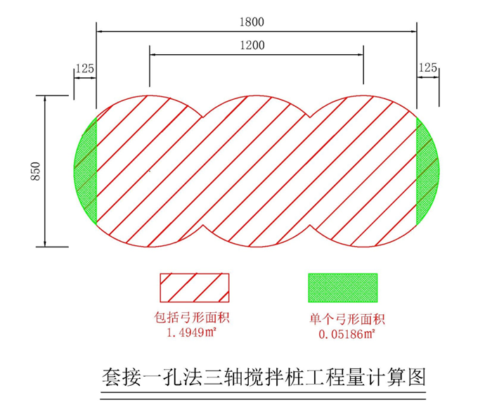 2.關于ф850mm三軸水泥攪拌樁套接一孔法施工的,單幅樁間距1.2m、截面面積1.4949m2,工程量計算規則是按成樁后的單幅樁樁長乘以截面積以“m3 ”計算,其工程量計算公式是什么?