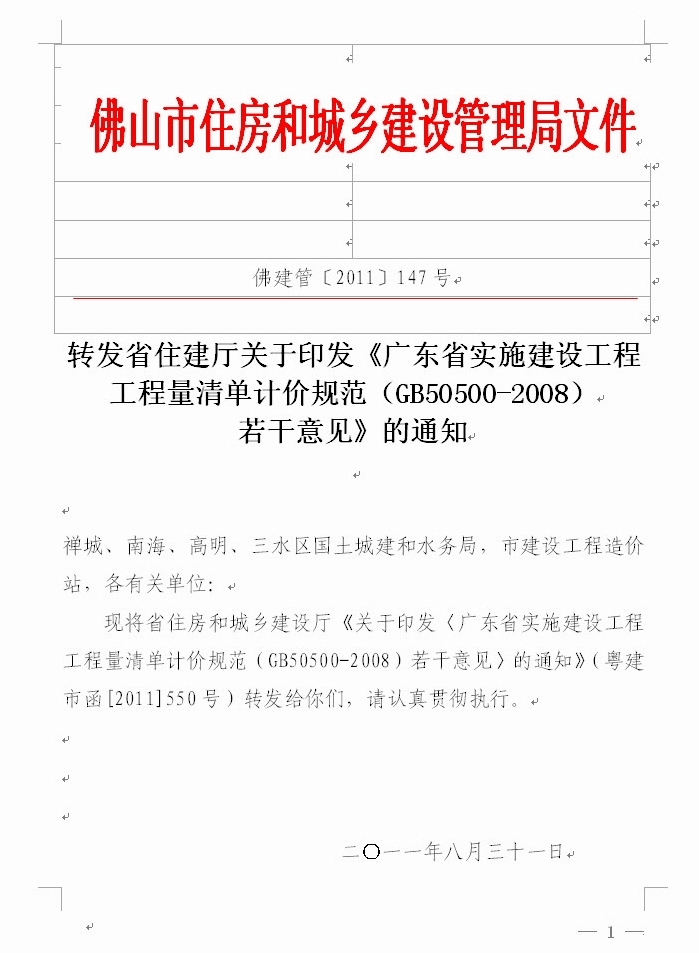 轉(zhuǎn)發(fā)省住建廳關(guān)于印發(fā)《廣東省實(shí)施建設(shè)工程工程量清單計(jì)價(jià)規(guī)范(GB50500-2008)