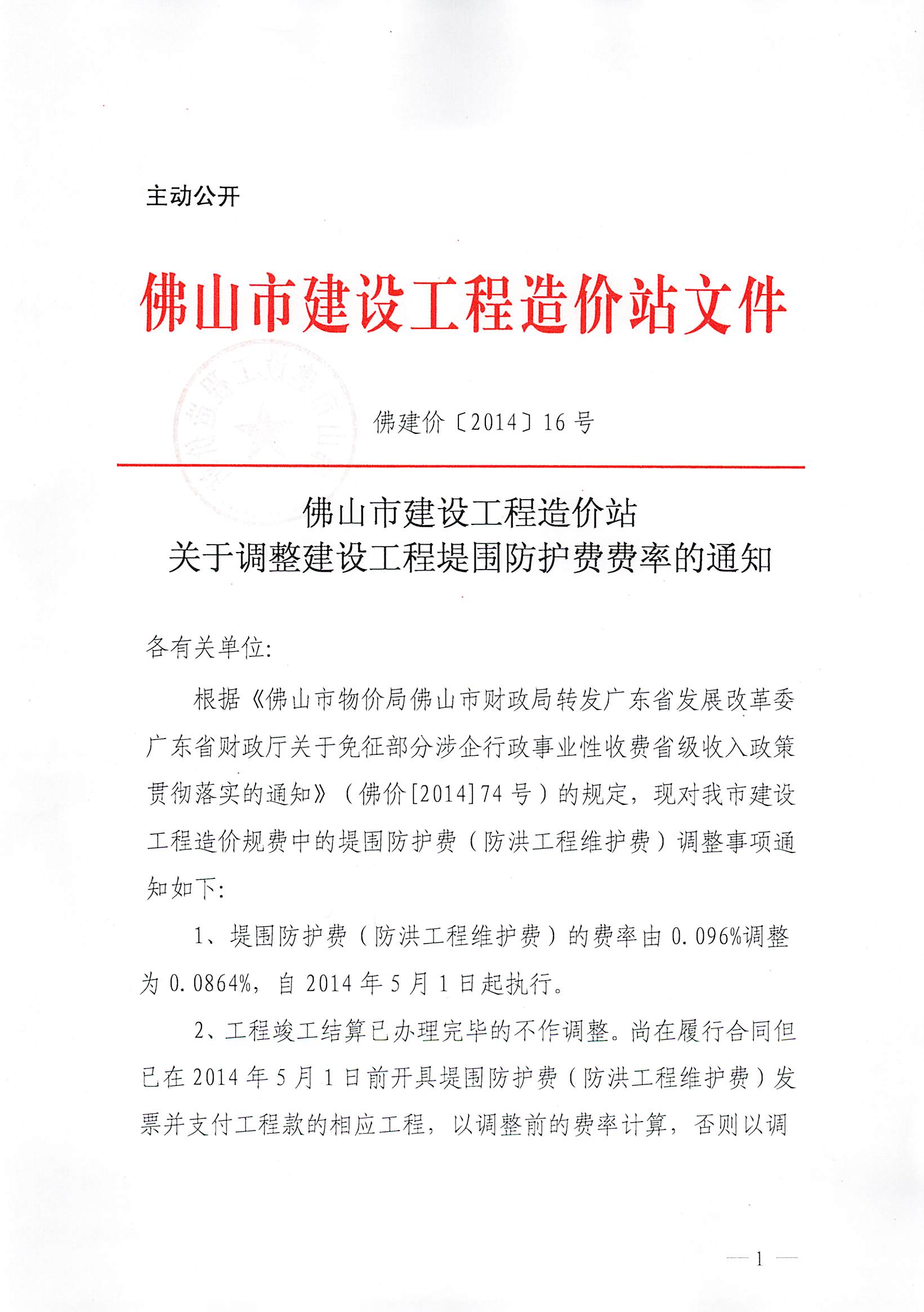 佛山市建設(shè)工程造價站關(guān)于調(diào)整建設(shè)工程堤圍防護費費率的通知