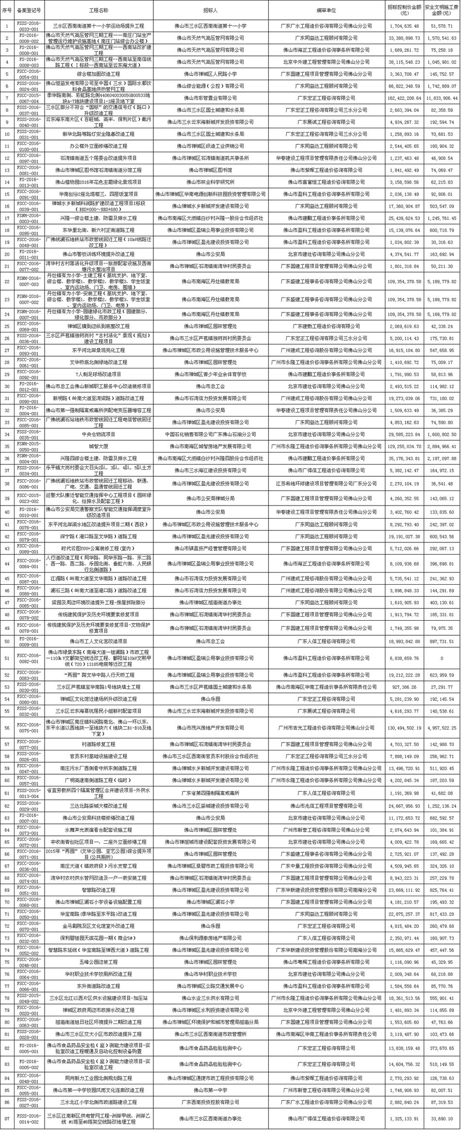 佛山市招標控制價備案情況表(2016-07-01至2016-09-30)