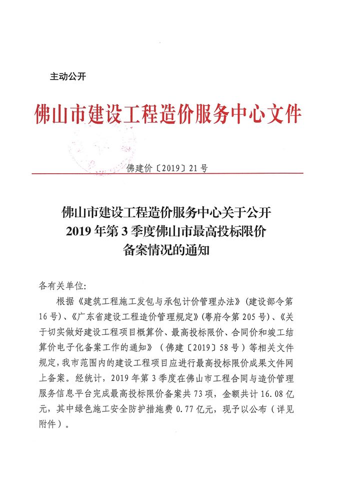 佛山市建設工程造價服務中心關于公開2019年第3季度佛山市招標控制價備案情況的通知