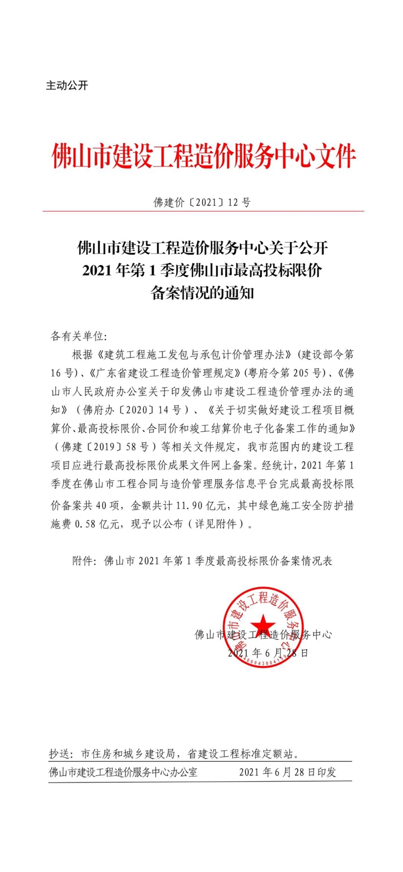 佛山市建設工程造價服務中心關于公開2021年第1季度佛山市最高投標限價備案情況的通知