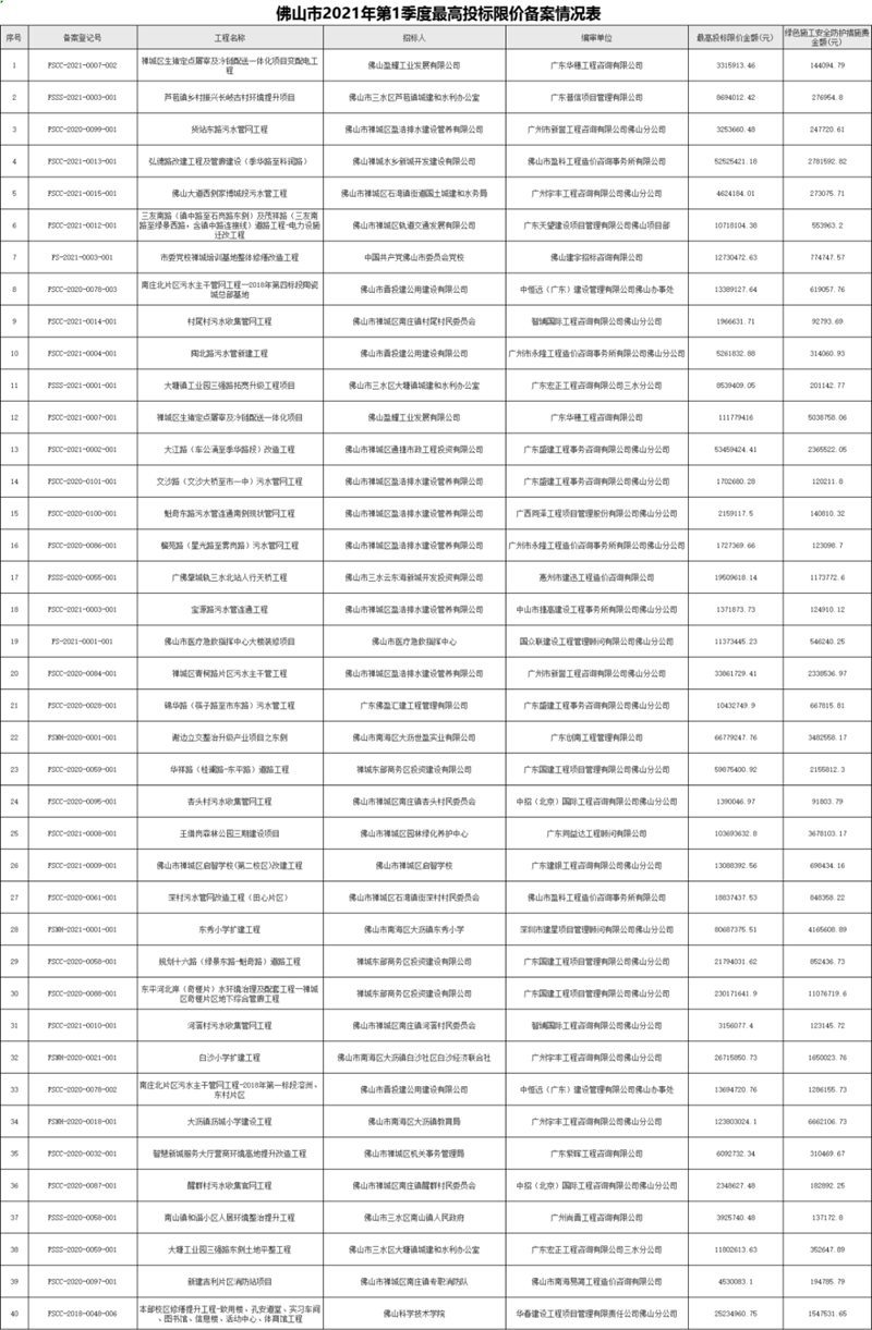 附件:佛山市2021年第1季度最高投標限價備案情況表