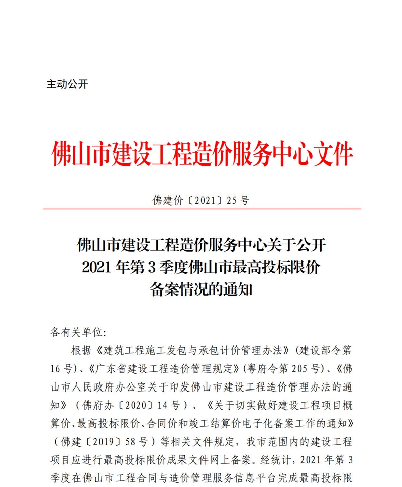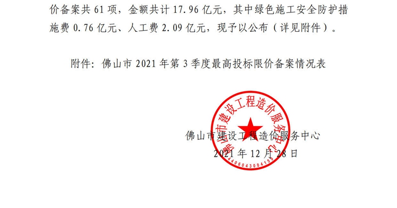 佛山市建設工程造價服務中心關于公開2021年第3季度佛山市最高投標限價備案情況的通知