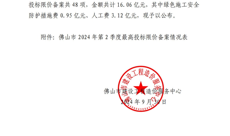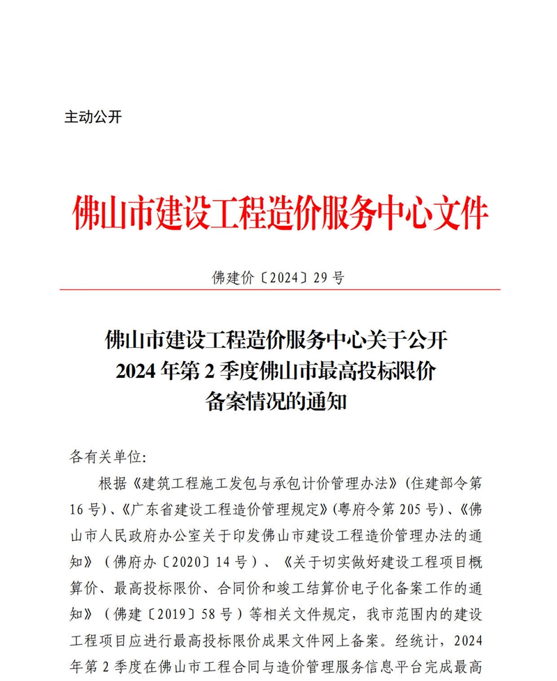佛山市建設(shè)工程造價服務(wù)中心關(guān)于公開2024年第2季度佛山市最高投標(biāo)限價備案情況的通知