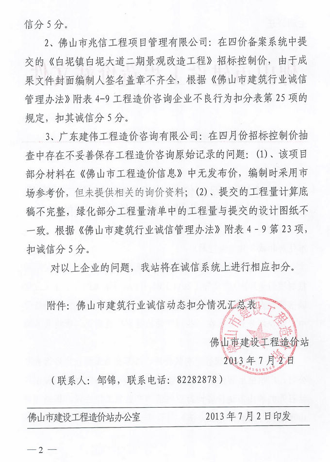 佛山市建設工程造價站關于2013年第二季度佛山市造價咨詢企業誠信經營檢查情況的報告