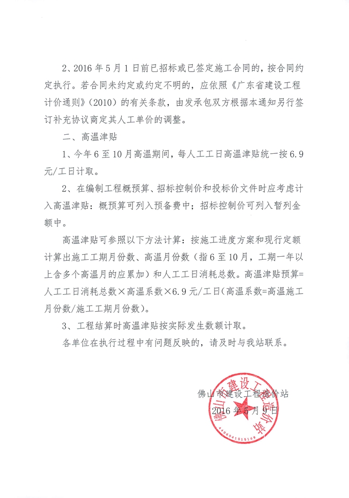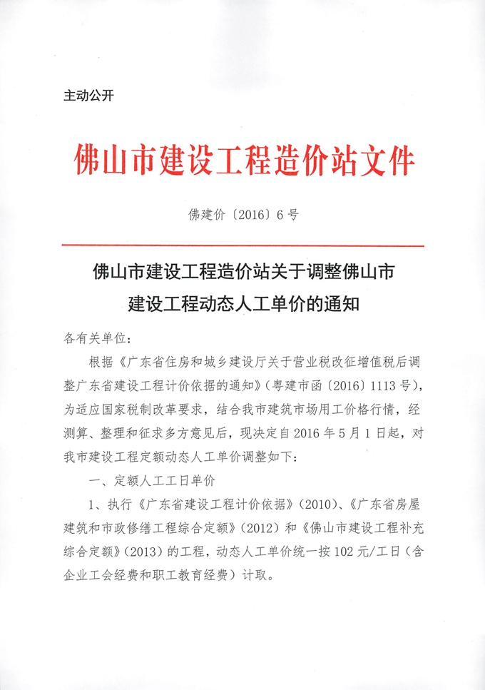 佛山市建設工程造價站關于調整佛山市建設工程動態人工單價的通知