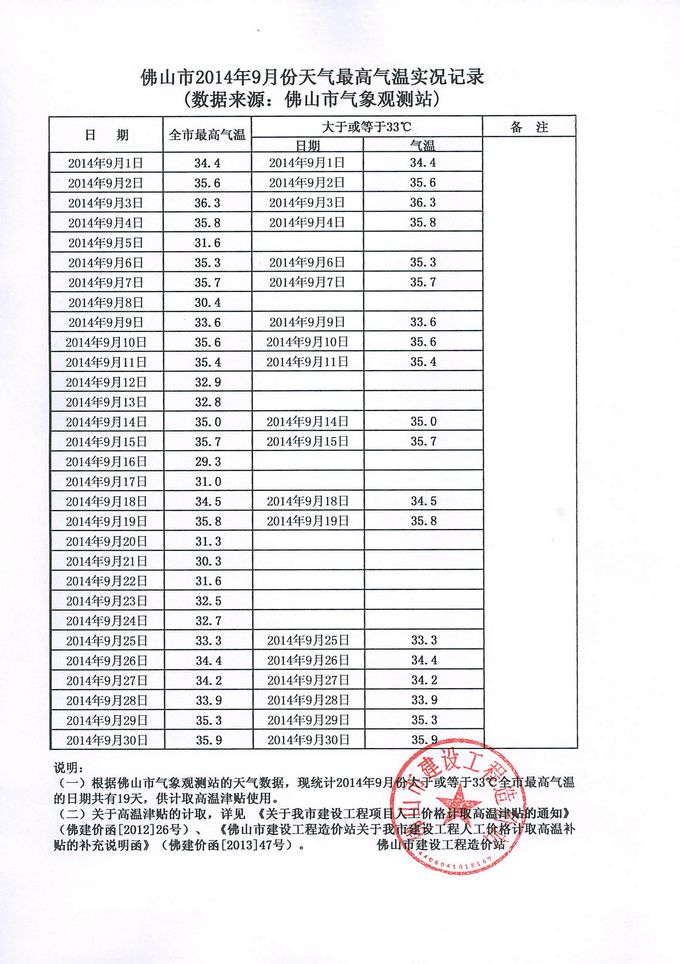 佛山市建設工程造價站關于我市建設工程人工價格計取高溫補貼的補充說明函》(佛建價函[2013]47號)