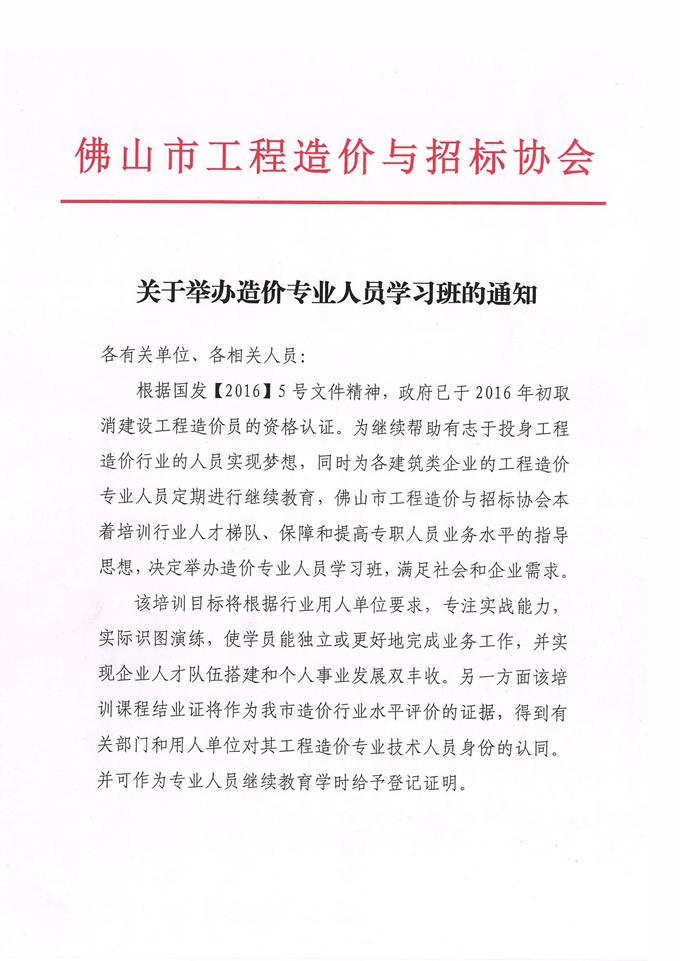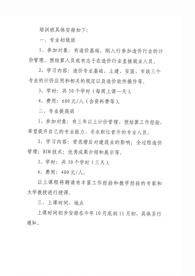 關(guān)于舉辦造價專業(yè)人員學(xué)習(xí)班的通知