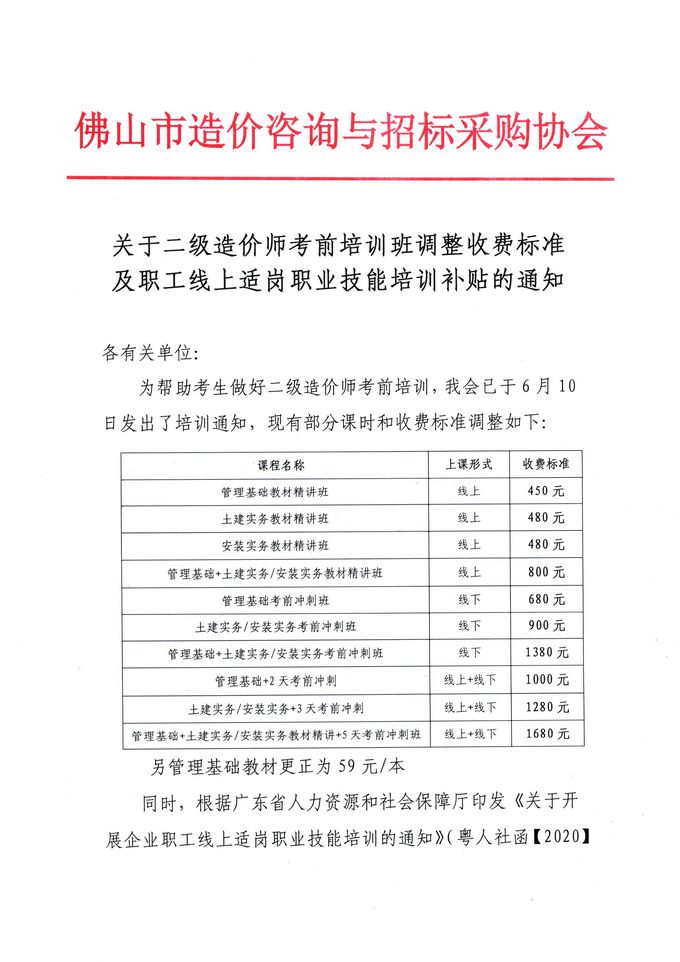 關于二級造價師考前培訓班調整收費標準及職工線上適崗職業技能培訓補貼的通知