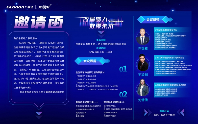為讓更多造價從業人員了解資質取消相關內容,了解行業內數字化實踐思路,特此舉辦《改革聚力 數聚未來--- 造價資質取消后時代線上紛享會》,會議將于2021年6月24日下午線上舉辦,屆時廣東造價行業從業人員線上參與本次活動。現將有關事項通知如下:
