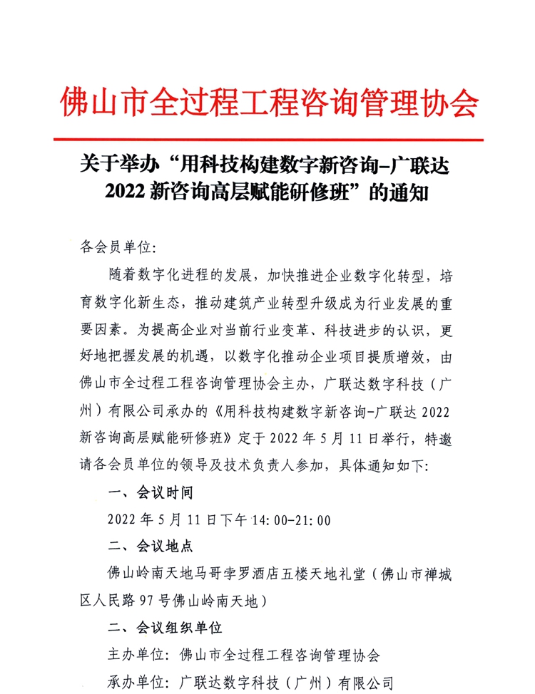 關(guān)于舉辦“用科技構(gòu)建數(shù)字新咨詢-廣聯(lián)達(dá)2022新咨詢高層賦能研修班”的通知
