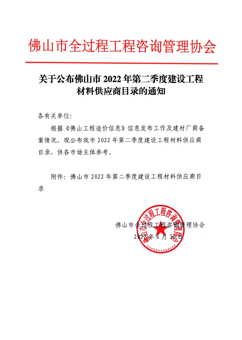 關于公布佛山市2022年第二季度建設工程材料供應商目錄的通知