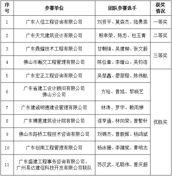 經(jīng)過(guò)一天激烈的角逐,最終決出團(tuán)體獎(jiǎng)共11名(分別是一等獎(jiǎng)1名、二等獎(jiǎng)1名、三等獎(jiǎng)2名、優(yōu)勝獎(jiǎng)7名),“佛山市技術(shù)能手”8名,突出貢獻(xiàn)獎(jiǎng)6名(個(gè)人3名、單位3名),優(yōu)秀組織獎(jiǎng)6名。經(jīng)公示后,具體名單公布如下: