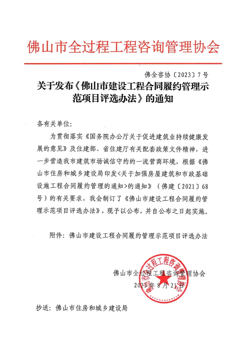 關于發(fā)布《佛山市建設工程合同履約管理示范項目評選辦法》的通知