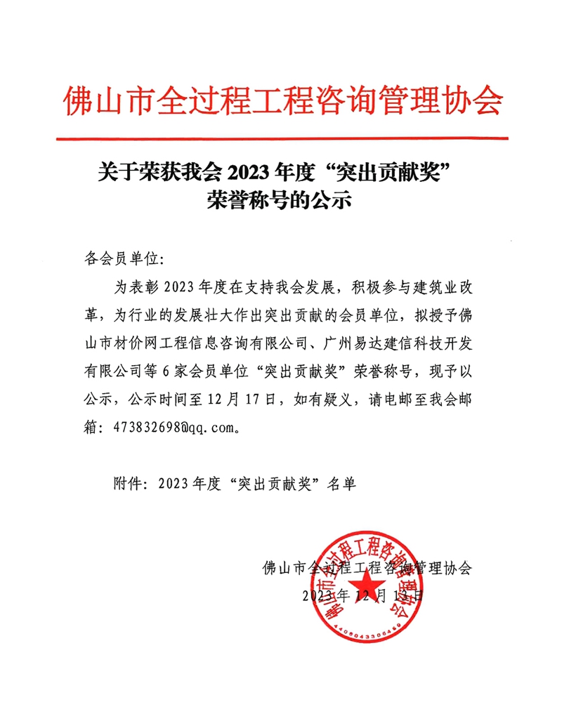 關于榮獲我會2023年度“突出貢獻獎”榮譽稱號的公示