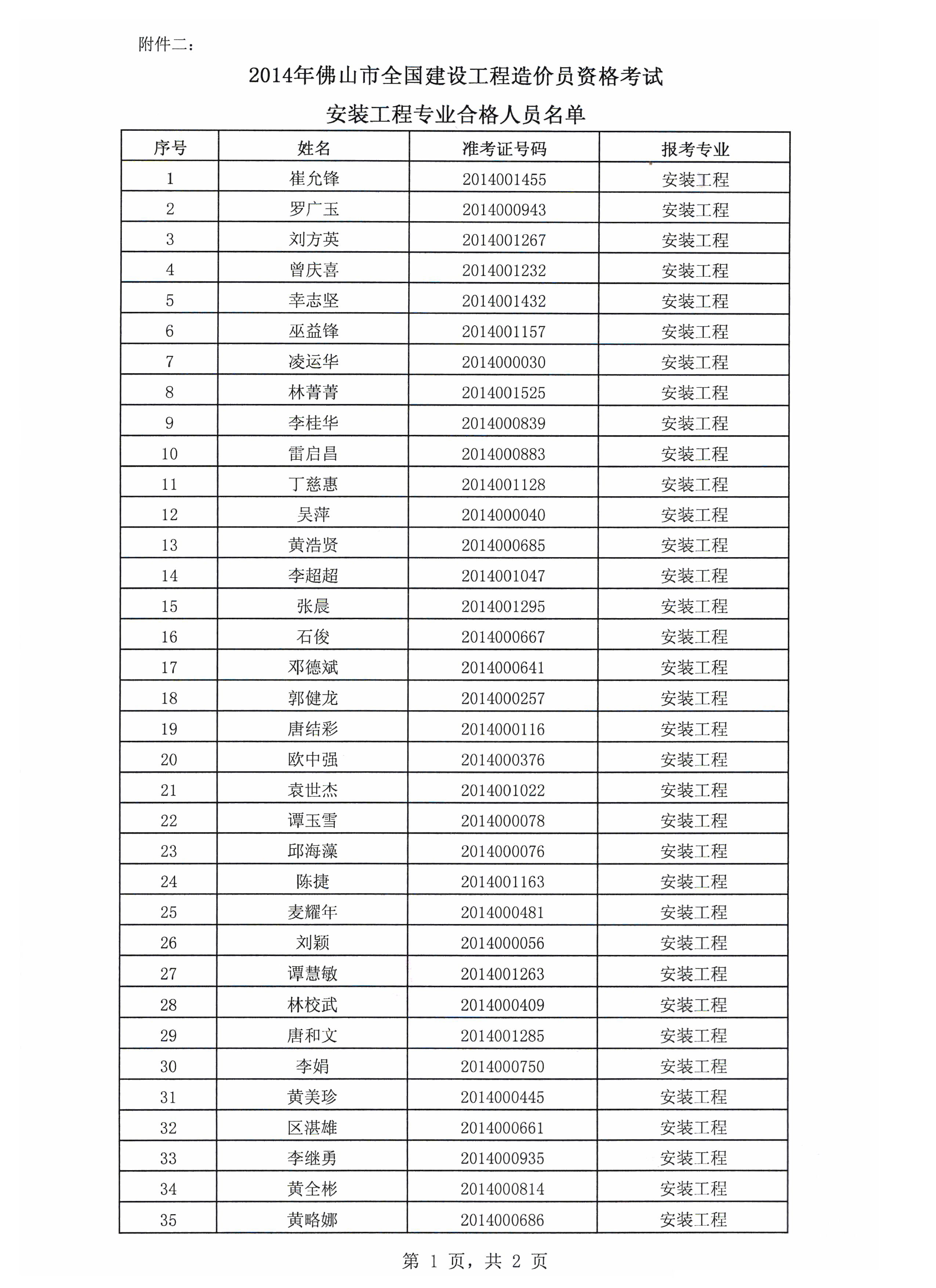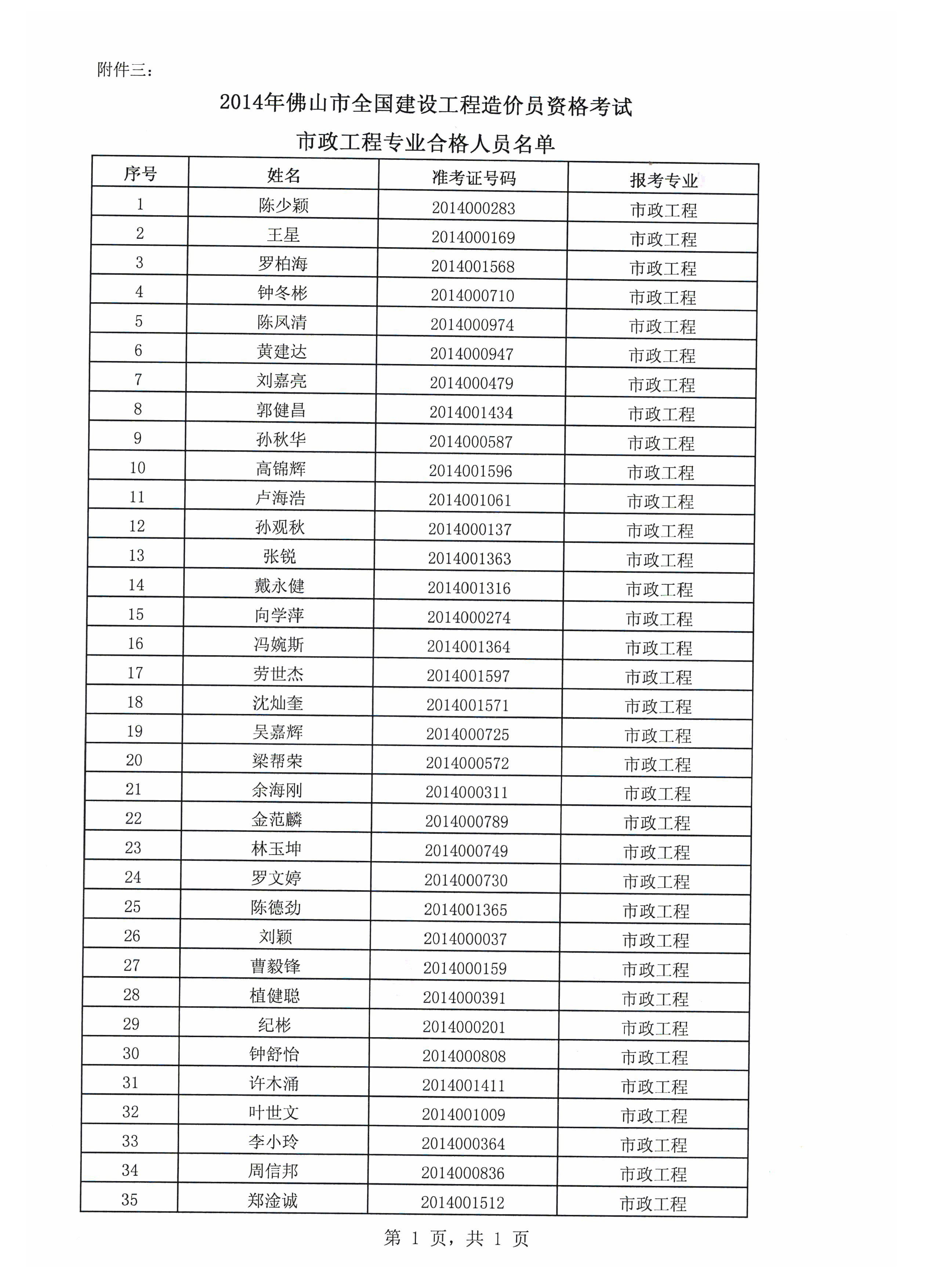 關(guān)于公布2014年度佛山市全國建設(shè)工程造價員資格考試結(jié)果的函