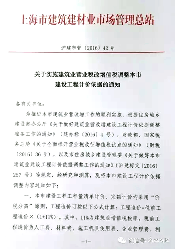 上海市建筑建材業(yè)市場管理總站關(guān)于實施建筑業(yè)營業(yè)稅改增值稅調(diào)整本市建設(shè)工程計價依據(jù)的通知