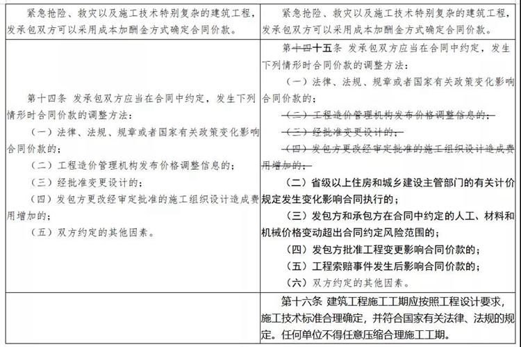 一是增加關于工期的條款。二是刪除原辦法中有關工程造價鑒定內容。三是規范文字表述。將“住房城鄉建設主管部門”統一修改為“住房和城鄉建設主管部門”;將“縣級以上地方人民政府”統一修改為“縣級以上人民政府”;將“工程計價有關規定和市場價格信息”統一修改為“工程計價依據”。