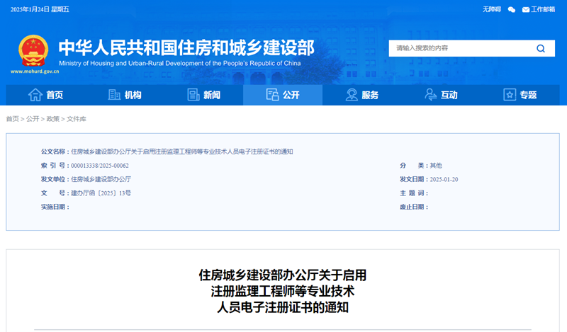 住建部 | 關于啟用注冊監理工程師等專業技術人員電子注冊證書的通知