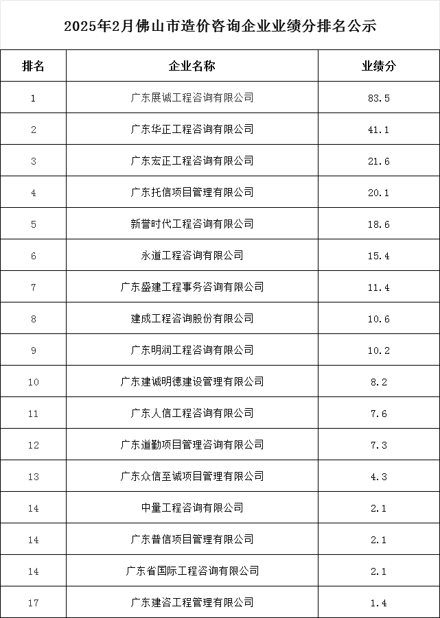轉發 | 2025年2月佛山市造價咨詢企業業績分排名公示
