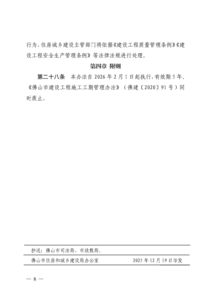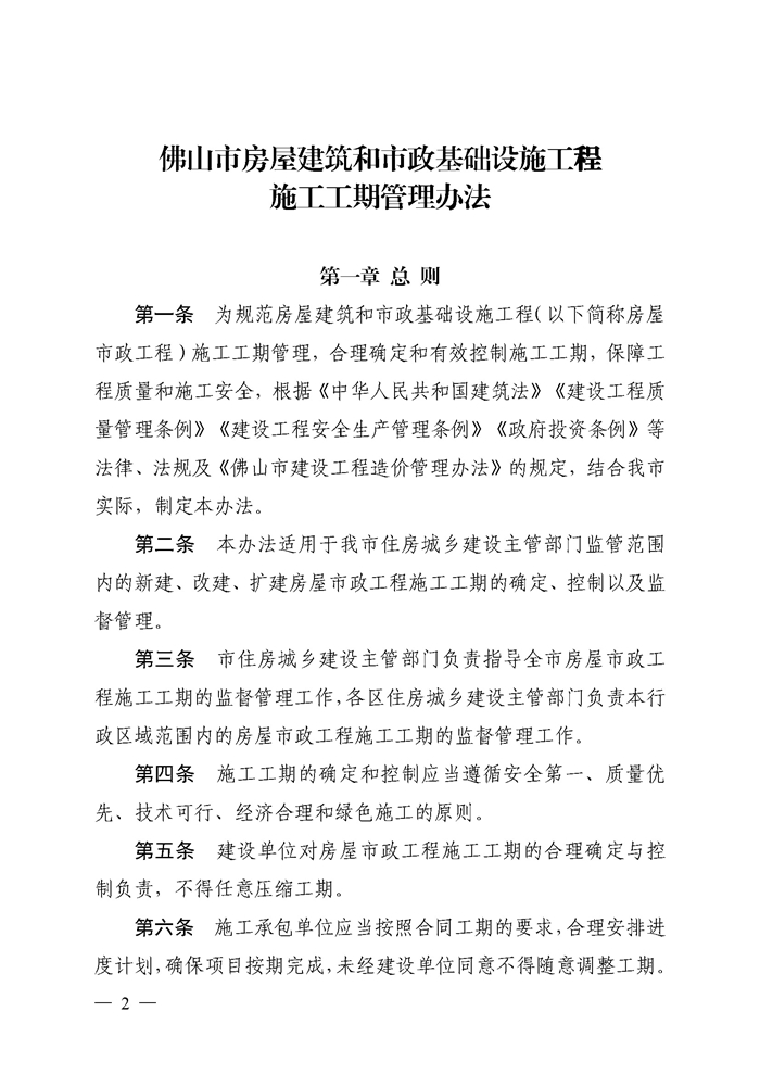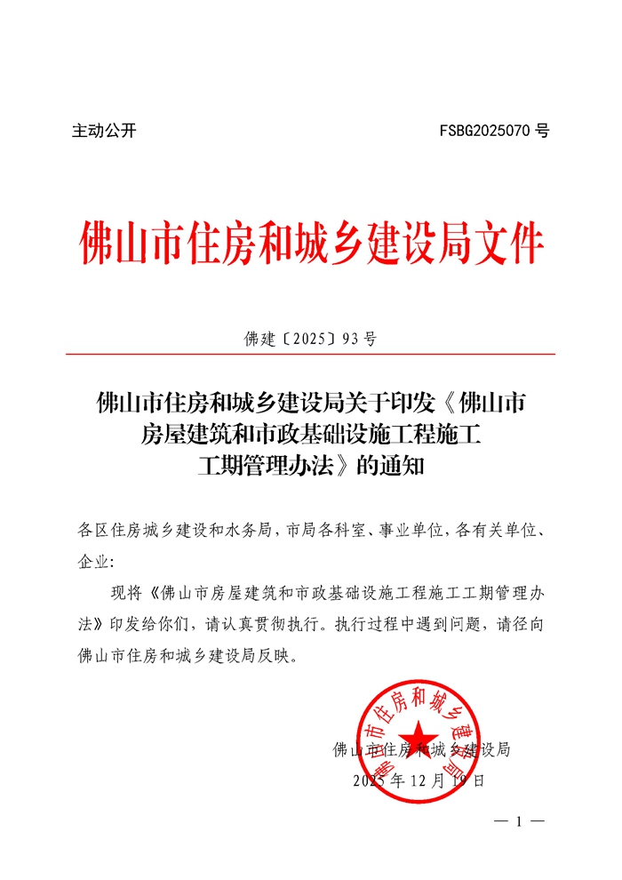 佛山市住房和城鄉(xiāng)建設(shè)局關(guān)于印發(fā)《佛山市房屋建筑和市政基礎(chǔ)設(shè)施工程施工工期管理辦法》的通知