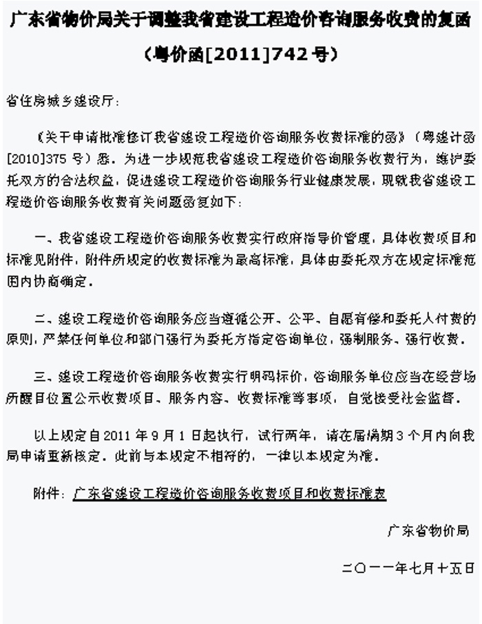廣東省物價局關于調整我省建設工程造價咨詢服務收費的復函