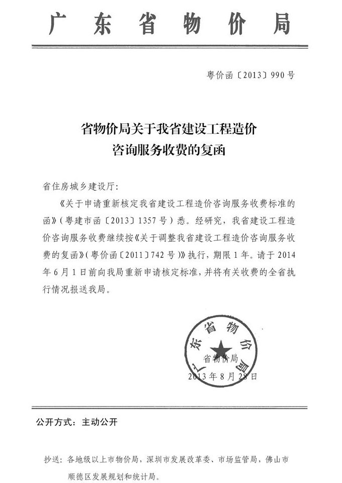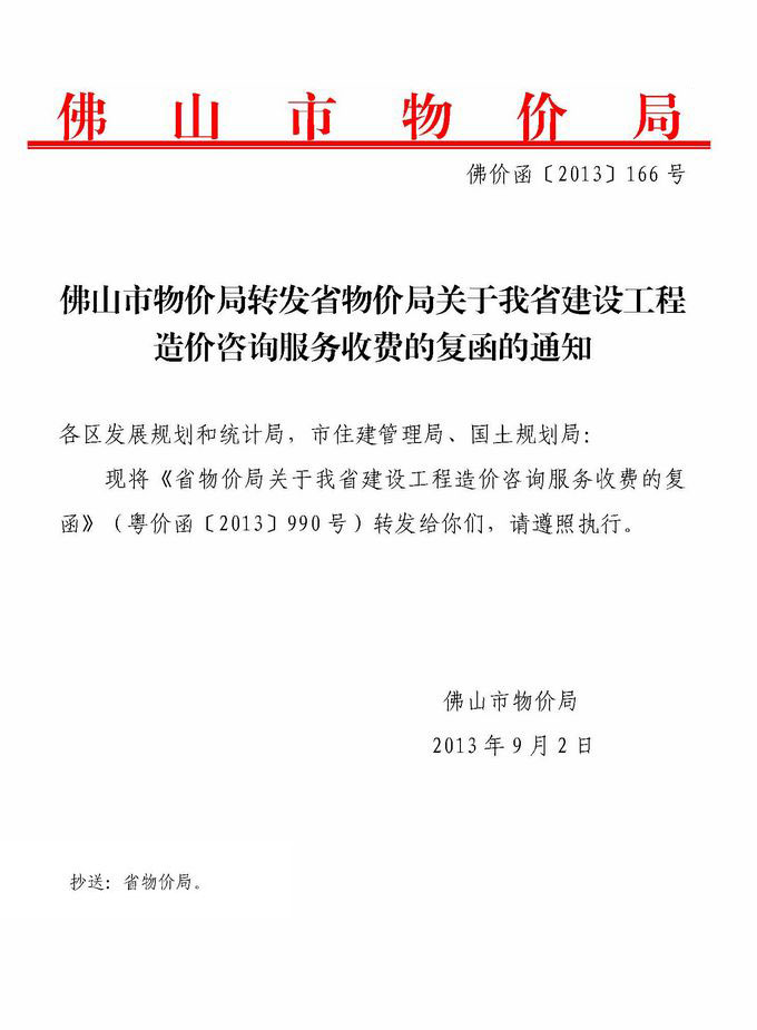佛山市物價局轉發省物價局關于我省建設工程造價咨詢服務收費的復函的通知
